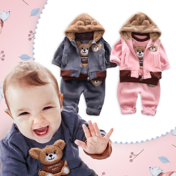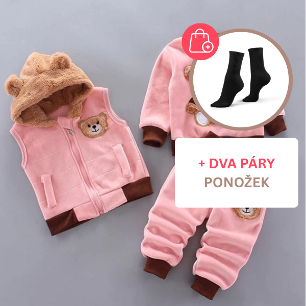 • V sadě: bunda s 3D motivem medvídka, kalhoty a vesta s kapucí